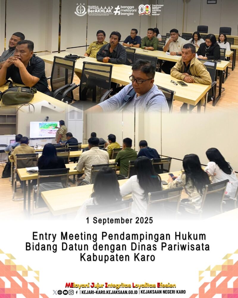 Tanah Karo, AgaraNews. Com // Kejaksaan Negeri Karo menggelar entry meeting pendampingan hukum dengan Dinas Pariwisata Kabupaten Karo pada Senin, 1 September 2025. Pertemuan ini membahas terkait pembangunan Tembok Penahan Objek Wisata Si Piso-Piso, pemasangan Pagar Pengaman Objek Wisata Si Piso-Piso, dan bangunan gedung tempat kerja lainnya.