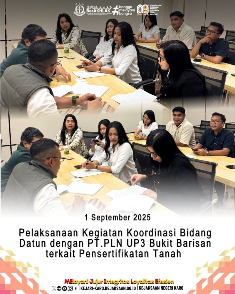 Tanah Karo, AgaraNews. Com // Kejaksaan Negeri Karo melakukan koordinasi dengan PT. PLN UP3 Bukit Barisan pada Senin, 1 September 2025. Pertemuan ini membahas terkait pensertifikatan tanah milik PT. PLN.