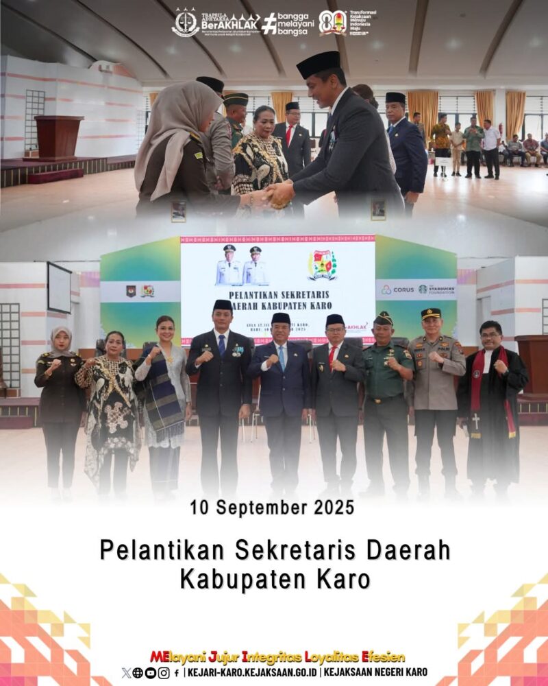 Tanah Karo, AgaraNews.com // Kejaksaan Negeri Karo diwakili oleh Jaksa Fungsional Intelijen Zakia Ultari Ginting, S.H, menghadiri pelantikan Sekretaris Daerah Kabupaten Karo, DR. Gelora Kurnia Putra Ginting, S.STP, M.M, pada Rabu, 10 September 2025. Acara pelantikan ini berlangsung di Aula Kantor Bupati Karo.