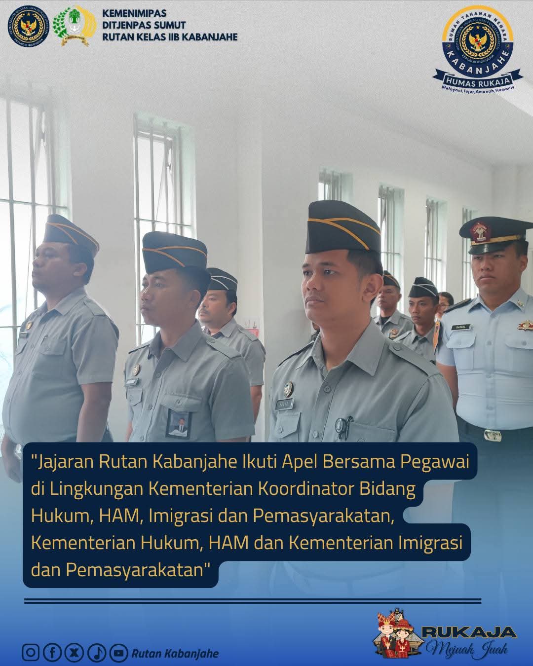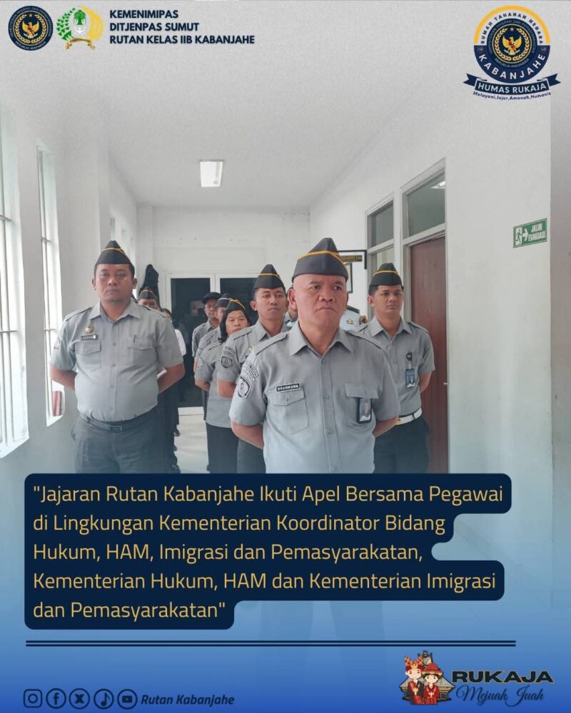 Kegiatan apel bersama ini berjalan dengan lancar, tertib, dan penuh semangat. Melalui kegiatan ini, jajaran Rutan Kabanjahe bertekad untuk terus memberikan kontribusi positif dalam mendukung pelaksanaan tugas pemerintah, terutama dalam memberikan pelayanan terbaik kepada masyarakat dan warga binaan pemasyarakatan. Dengan adanya kegiatan ini, diharapkan sinergi antar-kementerian dapat semakin solid, efektif, dan berdampak nyata bagi masyarakat luas. ( Lia Hambali)