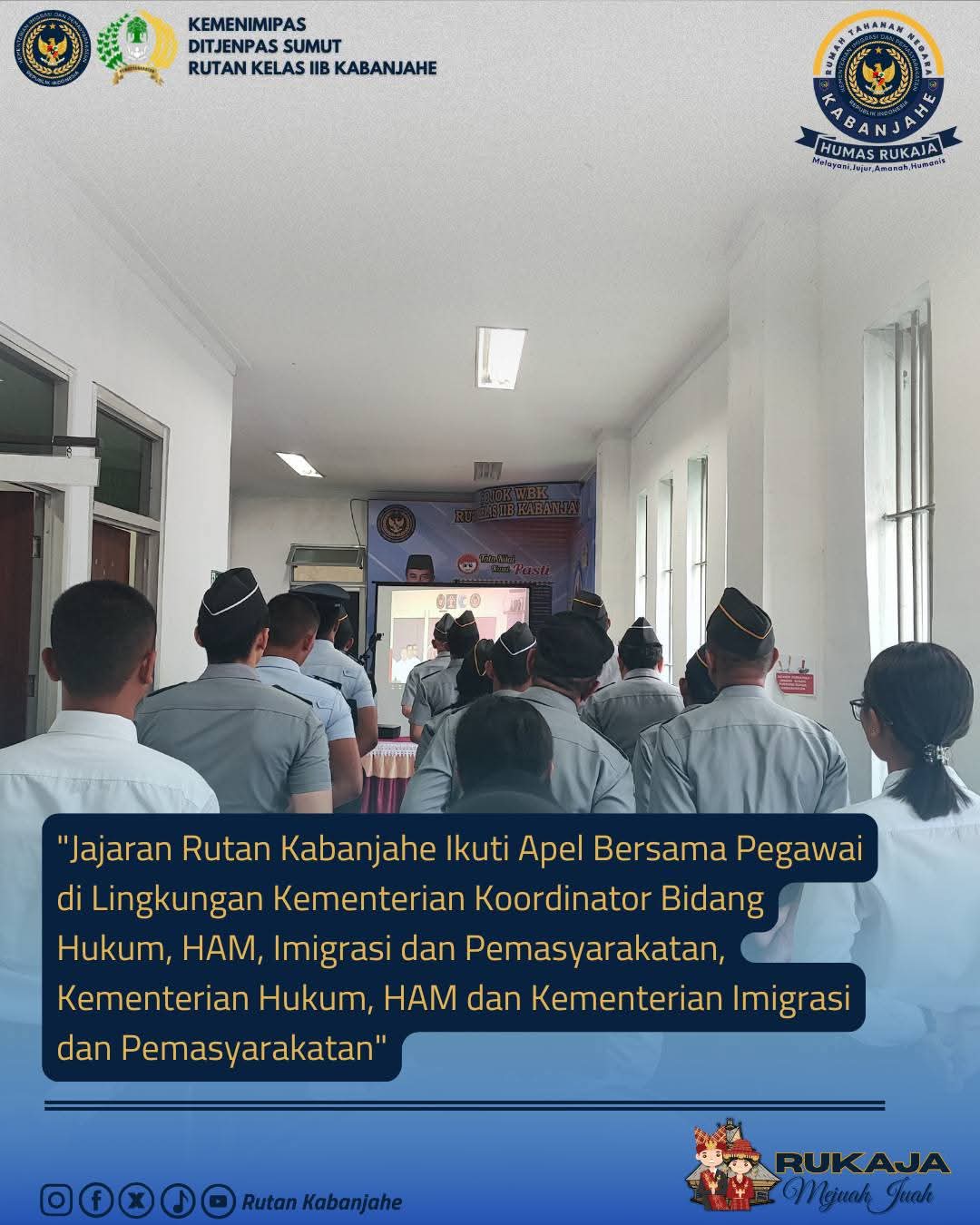 Tanah Karo – 15 September 2025, AgaraNews . Com // Seluruh jajaran Rumah Tahanan Negara (Rutan) Kabanjahe mengikuti kegiatan apel bersama yang dilaksanakan serentak oleh pegawai di lingkungan Kementerian Koordinator Bidang Hukum, HAM, Imigrasi, dan Pemasyarakatan. Apel bersama ini dilakukan secara virtual melalui Zoom pada Senin, 15 September 2025, pukul 07.30 WIB.