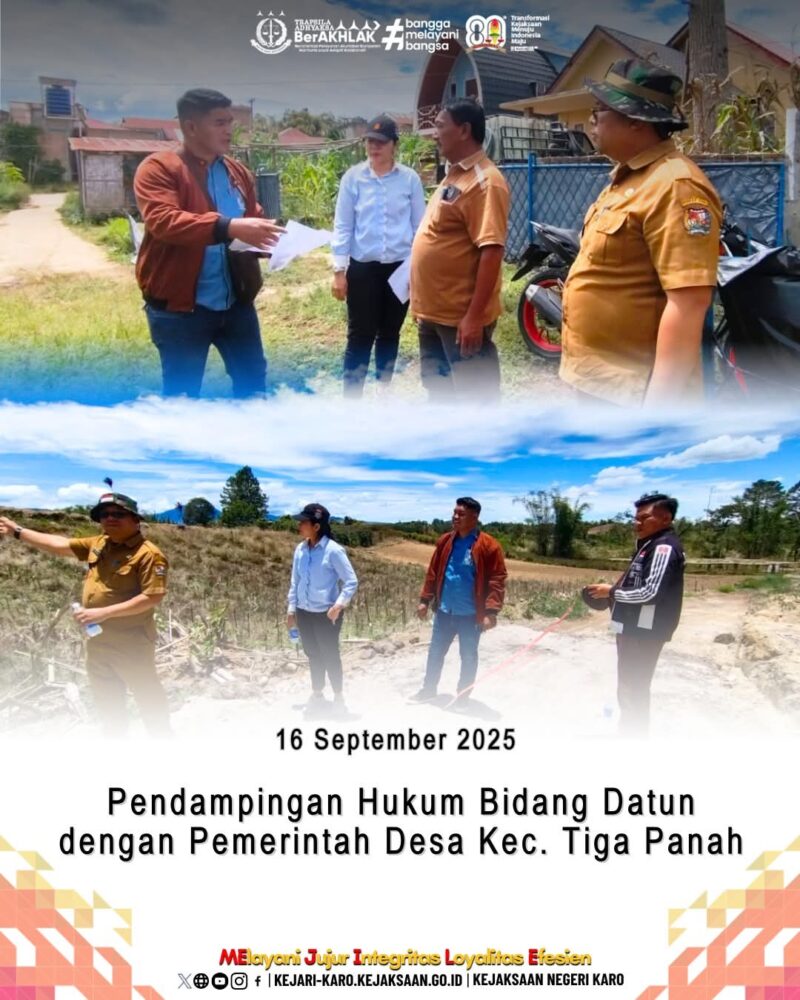 Tanah Karo – 16 September 2025, Ah . Com // Kejaksaan Negeri Karo melalui Kepala Seksi Perdata dan Tata Usaha Negara, Desy Angeline Simamora, S.H, dan Kasubsi Datun, Roy Andalan Pelawi, S.H, melakukan pendampingan hukum kepada beberapa desa di Kabupaten Karo. Desa-desa yang didampingi antara lain Desa Suka, Desa Seberaya, Desa Ajijahe, dan Desa Tiga Panah.