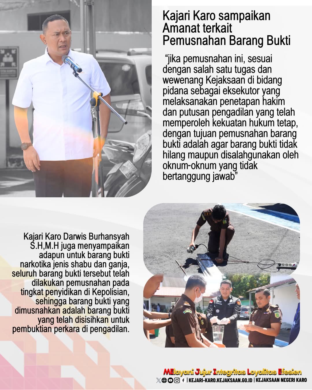 Kejaksaan Negeri Karo berkomitmen untuk terus menjalankan tugas dan fungsinya dalam penegakan hukum. Pemusnahan barang bukti ini merupakan salah satu contoh komitmen Kejaksaan Negeri Karo dalam menjalankan tugasnya.