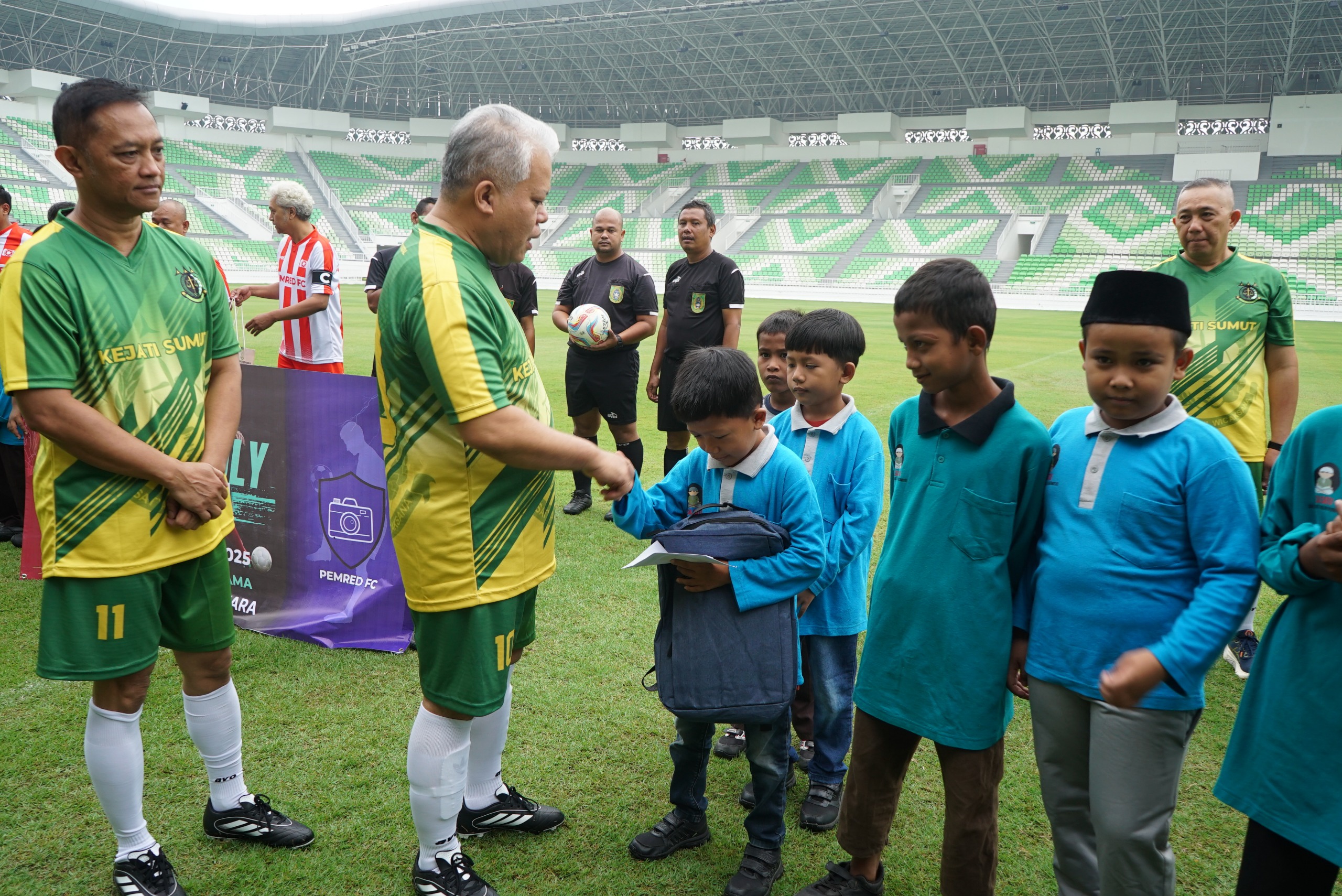 Sebelum pertandingan dimulai, Kajati Sumut bersama Pejabat utama dan para pimpinan redaksi memberikan paket bantuan kepada anak yatim yang turut diundang pada kegiatan itu.