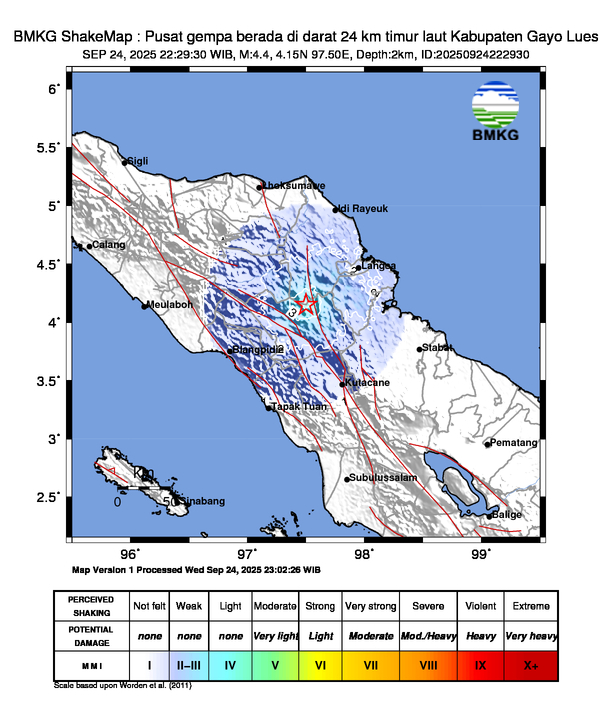 Gayo Lues – Gempa bumi dengan magnitudo 4,4 mengguncang wilayah Gayo Lues, Aceh, pada Rabu malam (24/9/2025). Gempa terjadi pukul 22.29 WIB dan dirasakan oleh warga di beberapa wilayah sekitarnya.