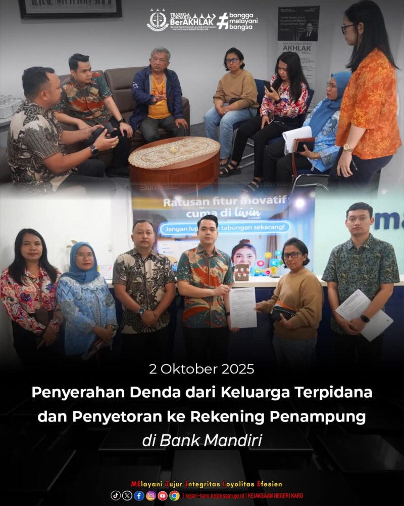Penerimaan uang denda ini berdasarkan putusan Mahkamah Agung RI Nomor 5972 K/Pid.Sus/2025 tanggal 20 Agustus 2025. Kejaksaan Negeri Karo diwakili oleh Wira Arizona, S.H, M.H, sebagai Kasubsi Penuntutan, Upaya Hukum Luar Biasa, Eksekusi.