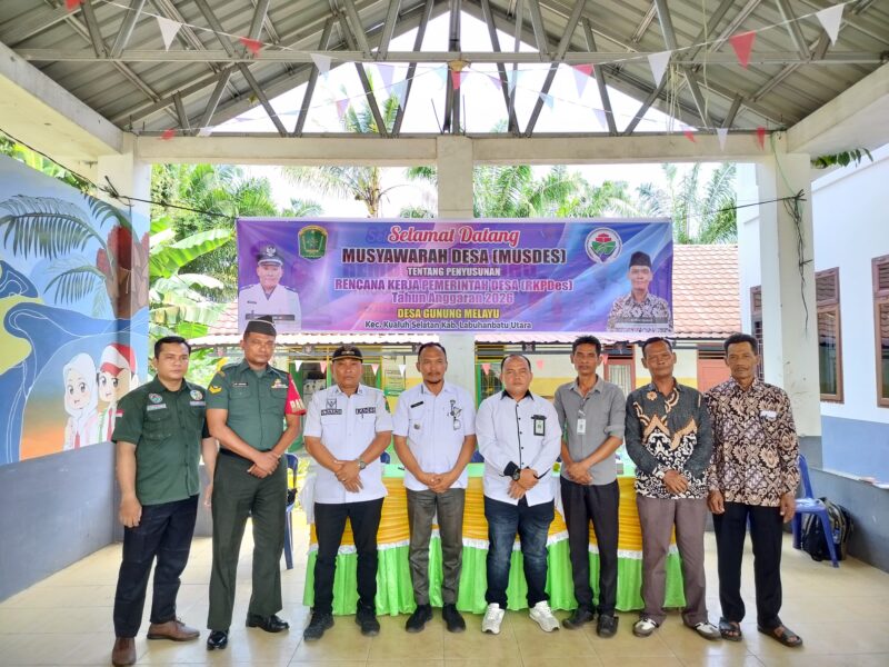 Labura, AgaraNews.com // Sebagai prajurit kewilayahan, Babinsa Koramil 01/AK Kodim 0209/LB Sertu Ari Gunawan menghadiri rapat kerja pemerintah desa Gunung Melayu tahun anggaran 2026 di balai desa Gunung Melayu Kecamatan Kualuh Selatan Kabupaten Labuhanbatu Utara. Pada Rabu 8/10/2025.