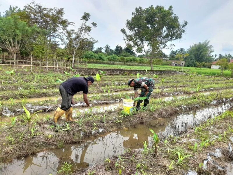 Aceh Utara, AgaraNews.com // Babinsa Koramil 28/Pirak Timu Kodim 0103/Aceh Utara, Serda M. Nasir, melaksanakan kegiatan pendampingan kepada petani dalam program Hanpangan dengan membantu proses pemupukan tanaman jagung milik Khairuddin (35) di Desa Bilibaro, Kecamatan Pirak Timu, Kabupaten Aceh Utara, Minggu (12/10/2025).