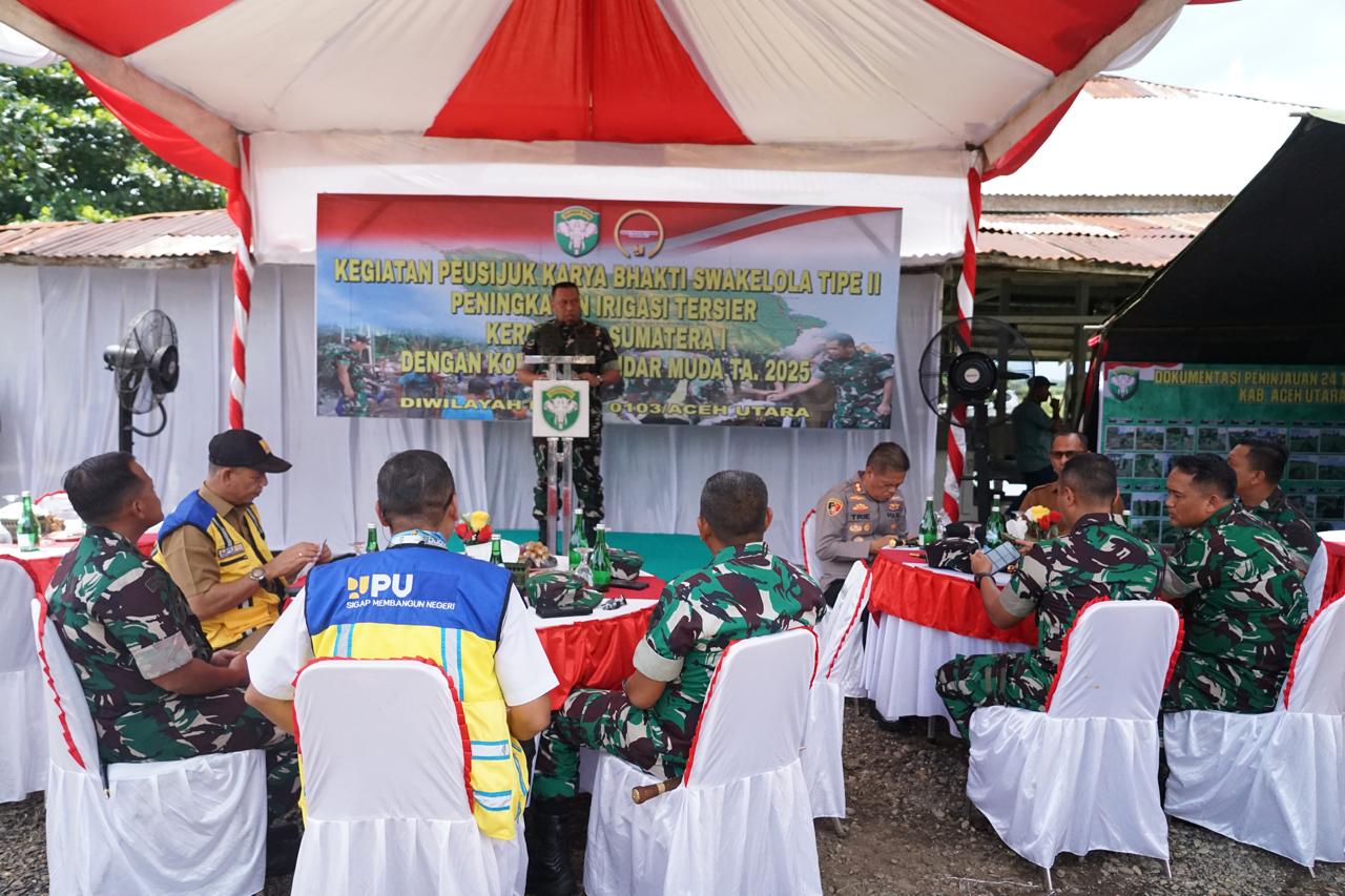 Dalam sambutannya, Kasdam IM Brigjen TNI Yudha Fitri menyampaikan bahwa Kodam Iskandar Muda berkomitmen penuh untuk mendukung program pemerintah di bidang ketahanan pangan nasional melalui pelaksanaan Program Karya Bhakti Swakelola Tipe II. Program ini merupakan bukti nyata kolaborasi antara TNI, pemerintah daerah, dan masyarakat dalam membangun sarana pertanian yang sangat vital, yaitu jaringan irigasi tersier di berbagai wilayah Provinsi Aceh.