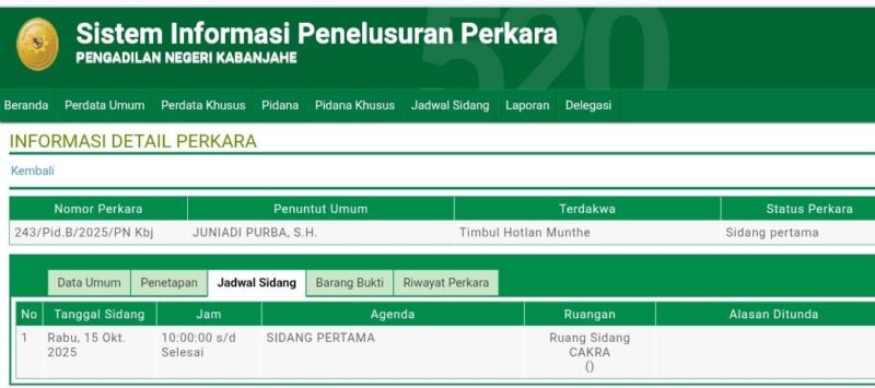 Hal itu diketahui berdasarkan daftar jadwal sidang yang dapat diakses pada sistem informasi penelusuran perkara pengadilan kabanjahe (SIPP-PN) Kabanjahe di alamat website http://sipp.pn-kabanjahe.go.id/ resmi di umumkan oleh Pengadilan Negeri Kabanjahe.
