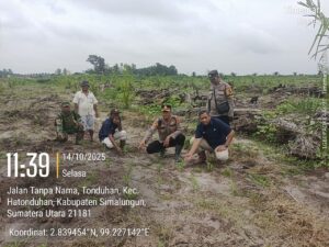 Simalungun, AgaraNews.com // Kapolsek Tanah Jawa Kompol Asmon Bufitra, S.H., M.H., menggelar serangkaian kegiatan strategis di Kecamatan Hatonduhan, Kabupaten Simalungun, Selasa (14/10/2025). Kegiatan dimulai dengan sambang dan patroli dialogis ke Kantor Camat Hatonduhan pukul 09.20 WIB, dilanjutkan dengan menghadiri program ketahanan pangan penanaman jagung di Afdeling I Kebun PTPN IV Regional II Tonduhan pukul 11.30 WIB, dalam rangka mendukung visi Indonesia Maju dan Indonesia Emas 2045.
