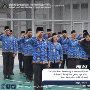 Tanah Karo, AgaraNews.com // Rutan Kabanjahe baru-baru ini menyelenggarakan upacara kebangsaan dalam rangka memperingati Hari Kesadaran Nasional pada Jumat, 17 Oktober 2025, bukan pada bulan Juli seperti tahun-tahun sebelumnya. Upacara tersebut dipimpin langsung oleh Kepala Rutan Kabanjahe, Bahtiar Sembiring.