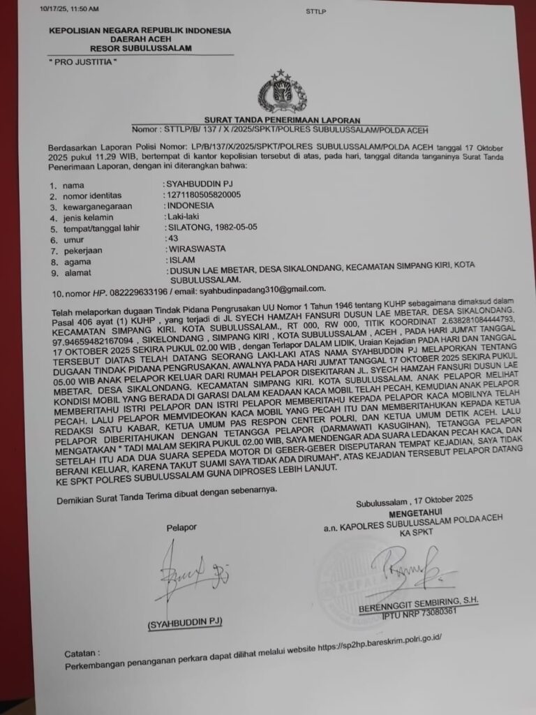 Kasus ini telah resmi dilaporkan ke Polres Subulussalam dengan Nomor Laporan: STTLP/B/137/X/2025/SPKT/POLRES SUBULUSSALAM/POLDA ACEH. Dalam laporannya, Syahbudin menyatakan bahwa serangan tersebut diduga kuat terkait dengan aktivitasnya sebagai wartawan.