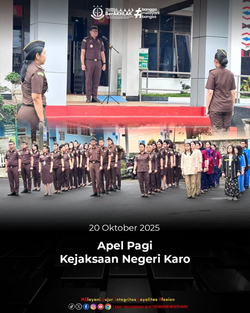 Tanah Karo, AgaraNews.com // Kejaksaan Negeri Karo melaksanakan Apel Pagi pada Senin, 20 Oktober 2025. Apel ini dipimpin oleh Kasi Pidsus Dr. Reinhard Harve, S.H., M.H., dan diikuti oleh seluruh Pegawai dan PPNPN Kejaksaan Negeri Karo.
