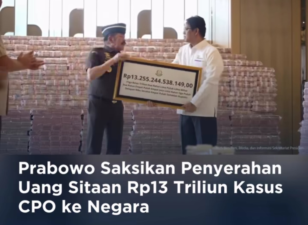 JAKARTA – Brekingnews,agranews.com, online,Presiden Republik Indonesia, Prabowo Subianto, secara langsung menyaksikan prosesi penyerahan uang hasil sitaan senilai Rp13 triliun terkait kasus dugaan korupsi ekspor Crude Palm Oil (CPO) di Gedung Kejaksaan Agung, Jakarta, Senin (20/10/2025).
