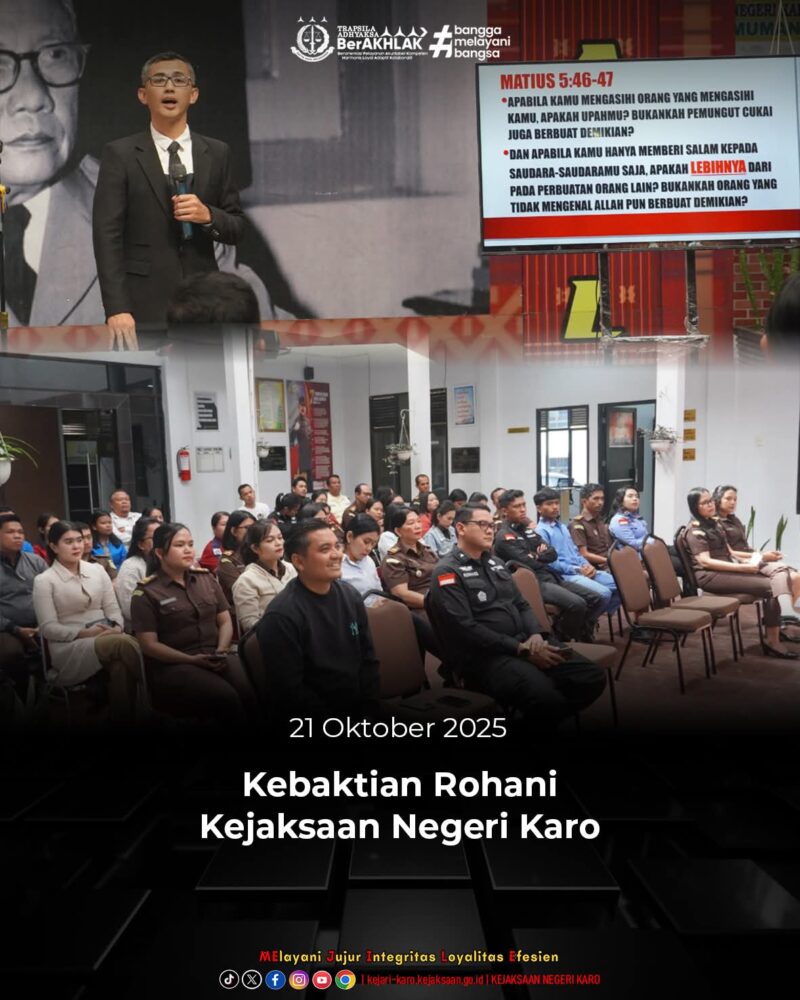 Tanah Karo, AgaraNews.com // Kejaksaan Negeri Karo menggelar kegiatan kebaktian rohani rutin untuk pegawai yang beragama Kristen pada Selasa, 21 Oktober 2025. Bertempat di Soeprapto Hall, kegiatan ini dihadiri oleh seluruh pegawai dan diisi dengan renungan oleh Bapak Pdt. Krispus Surbakti.