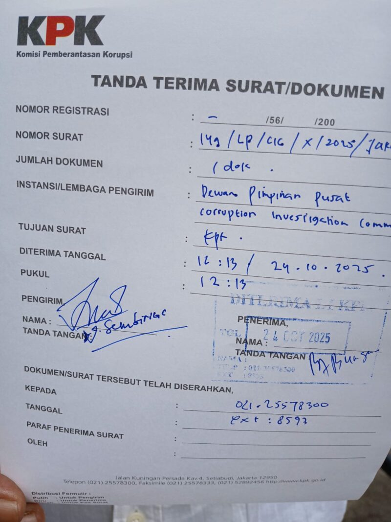 Sekretaris Jenderal DPP CIC DJ Sembiring menegaskan,” Kami melaporkan Dirut PJT II Purwakarta hasil dari inveatigasi yang CIC lakukan beberapa waktu lalu, dimana banyak terdapat “Bauk Busuk” dugaan korupsi didalam Perum Jasa Titra II, baik dari segi proyek mangkrak dan pelanggaran administrasi dan penyalagunaan wewenang jabatan saat mengangkat beberapa manager tanpa prosudural yang berlaku, ada indikasi dugaan membangun “Dinasti”.Untuk itu CIC Mendesak Komisi Pemberantasan Korupsi (KPK) dan Pihak Mabes Polri segera melakukan penyidikan terhadap Dirut PJT Imam Santoso,kabag SDM yang diduga melakukan penyalagunaan wewenang jabatan demi keuntungan kelompok maupun pribadi,” tegas DJ Sembiring Jumat (24/10/2025) kepada wartawan di Gedung Merah Putih KPK Jakarta.