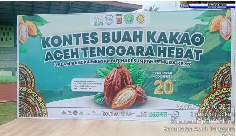 Semangat Sumpah Pemuda kembali menyala di bumi Aceh Tenggara. Menyambut peringatan Hari Sumpah Pemuda ke-97, Kodim 0108/Aceh Tenggara bersama Dinas Pertanian Kabupaten Aceh Tenggara siap menggelar ajang bergengsi bertajuk “Kontes Buah Kakao Aceh Tenggara Hebat”, Minggu, 26 Oktober 2025, di Lapangan Pemuda, Kompleks Pelajar, Kecamatan Babussalam.