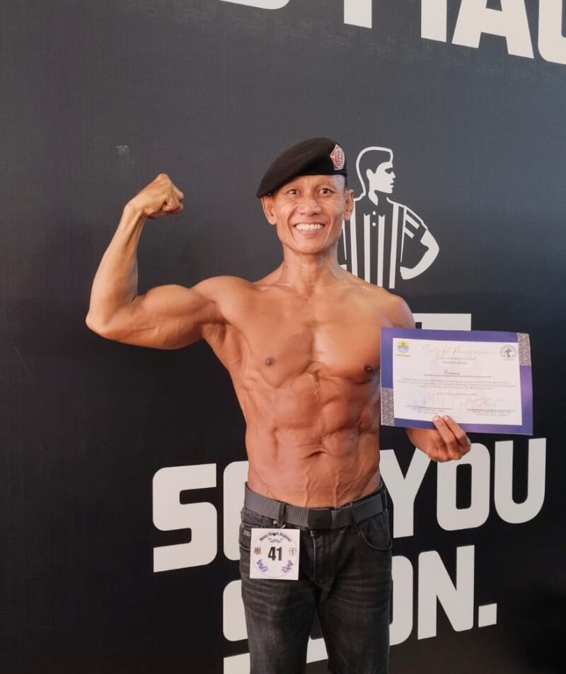 Kehadiran Purnomosidi “Prajurit Perang Pikiran” di Body Contest Piala Wali Kota Cirebon 2025 menjadi inspirasi bahwa semangat kebugaran dan gaya hidup sehat dapat dimulai kapan saja, tanpa batas usia.(Lia Hambali)