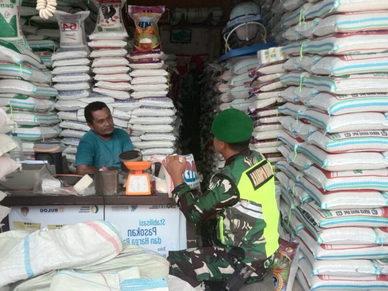 Dalam kunjungannya, Babinsa berinteraksi dengan pedagang, memantau langsung harga beras, dan mengecek stok beras yang tersedia.