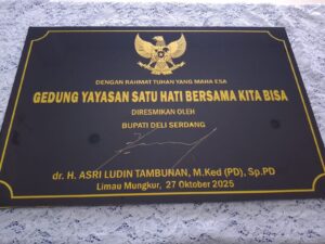 Deli Serdang, AgaraNews.com // Bupati Deli Serdang, dr. Asri Ludin Tambunan, meresmikan Gedung Baru Yayasan Satu Hati Bersama Kita Bisa di Kabupaten Deli Serdang pada Senin, 27 Oktober 2025. Peresmian ini dihadiri oleh berbagai tokoh penting, termasuk Muhammad Dahnil Ginting dari Fraksi Gerindra dan Direktur PT. Tri Bhala Chakti, Muhammad Rizki.