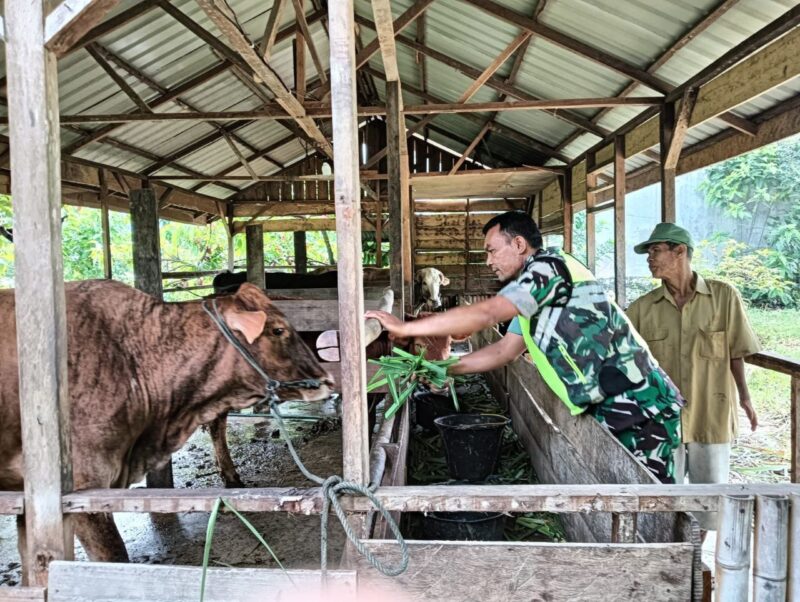 Kutacane Agaranews.com – Babinsa Koramil 0108-04/Babussalam Serma Dedi Arianto jajaran Kodim 0108/Agara membantu warga memberi pakan ternak sapi milik bapak Kasim di desa perapat Hilir Kecamatan. Babussalam. kabupaten Aceh Tenggara, Senin (27/10/2025).