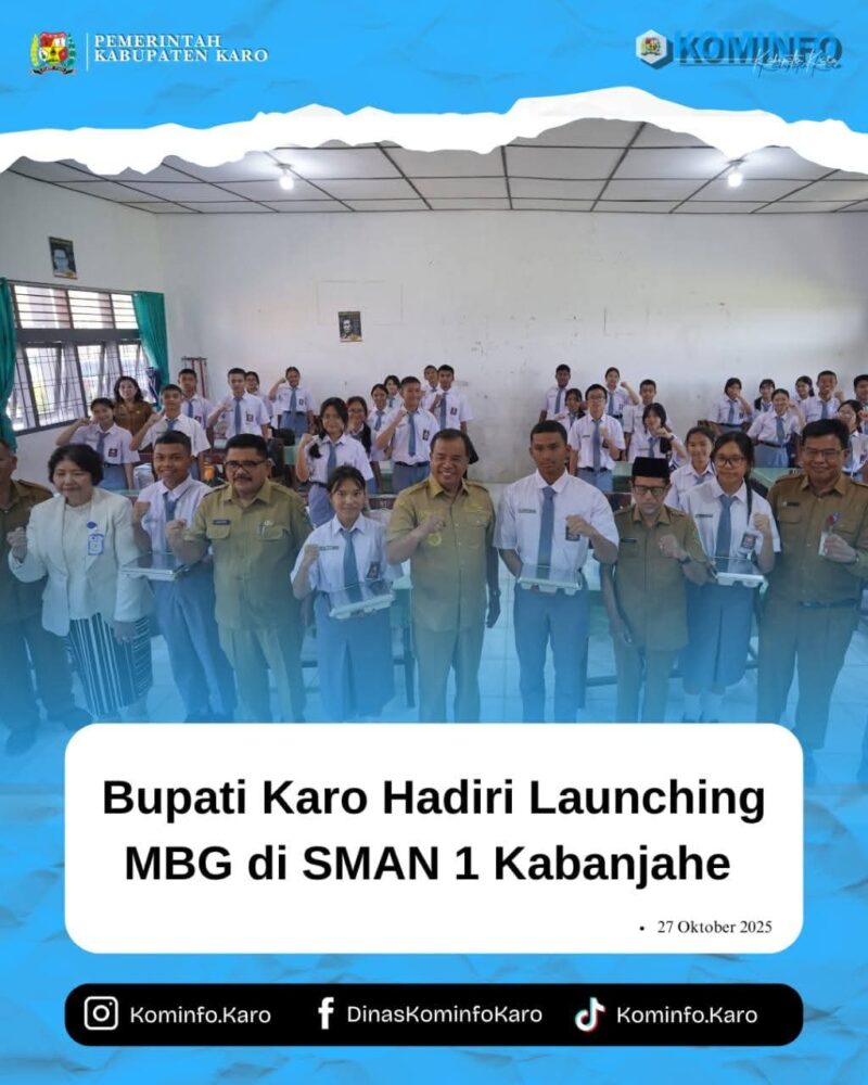 Tanah Karo – 27/10/2025, AgaraNews.com // Pemerintah Kabupaten Karo melalui Satuan Tugas Percepatan Penyelenggaraan Program Makan Bergizi Gratis (Satgas P3 MBG) melaksanakan kegiatan Launching dan Penyerahan Perdana Paket Makan Bergizi Gratis (MBG) bagi siswa-siswi SMA Negeri 1 Kabanjahe. Kegiatan ini dihadiri oleh Asisten Pemerintahan dan Kesejahteraan Rakyat Sekretariat Daerah Kabupaten Karo selaku Ketua Satgas P3 MBG, bersama unsur Asisten Perekonomian dan Pembangunan, Asisten Administrasi Umum, Kepala Dinas dan Badan terkait, Koordinator Wilayah Satuan Pelayanan Pemenuhan Gizi (SPPG), serta Camat Kabanjahe.