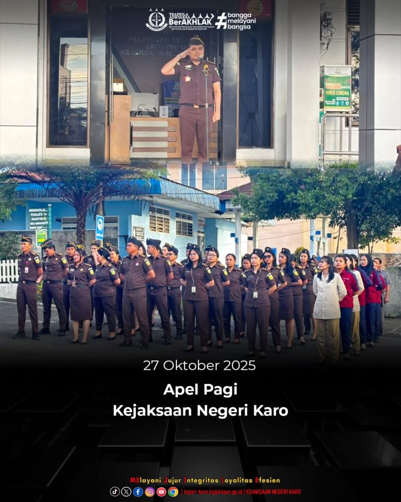 Tanah Karo, AgaraNews.com //.Kejaksaan Negeri Karo menggelar Apel Pagi pada Senin, 27 Oktober 2025, yang dipimpin oleh Kasi Pidum, Gus Irwan Marbun. Apel ini diikuti oleh seluruh pegawai dan PPNPN Kejaksaan Negeri Karo. Kegiatan ini merupakan bagian dari rutinitas kantor untuk meningkatkan kedisiplinan dan koordinasi antar pegawai.