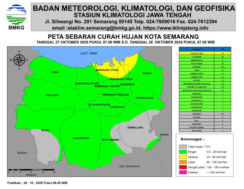 Jawa Tengah, 28 Oktober 2025, AgaraNews. Com // Badan Meteorologi, Klimatologi, dan Geofisika (BMKG) Jawa Tengah mengeluarkan peringatan dini cuaca untuk wilayah Jawa Tengah. Peringatan dini ini menyatakan bahwa masih berpotensi terjadi hujan sedang hingga lebat yang dapat disertai kilat/petir dan angin kencang pada pukul 11:50 WIB di beberapa wilayah.