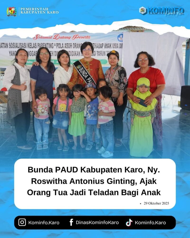 Tanah Karo – 29 Oktober 2025, AgaraNews .com // Bunda PAUD Kabupaten Karo, Ny. Roswitha Antonius Ginting, melaksanakan kegiatan Sosialisasi Kelas Parenting dengan tema “Pola Asuh Orang Tua terhadap Anak Usia Dini”. Kegiatan ini bertujuan untuk memberikan pemahaman kepada para orang tua tentang pentingnya peran mereka dalam membentuk karakter, kreativitas, serta kemampuan bersosialisasi anak sejak usia dini.