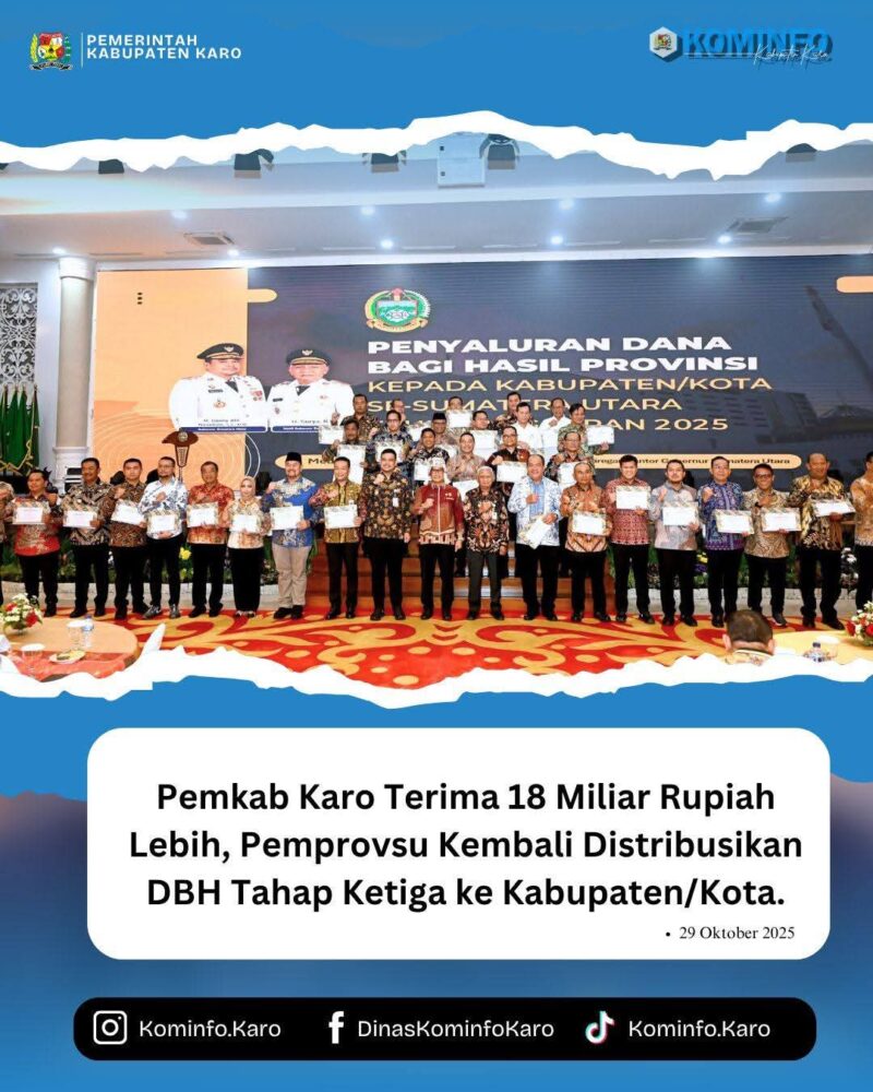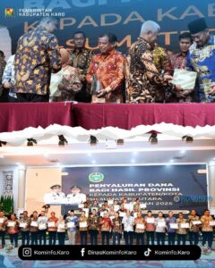 Medan, AgaraNews.com // Bupati Karo Brigjen Pol (Purn) Dr.dr.Antonius Ginting, Sp.OG,M.Kes terima kekurangan Dana Bagi Hasil (DBH) Tahun 2023 – 2025 sebesar Rp18.180.394.546 dari Pemerintah Provinsi Sumatera Utara. Penyerahan DBH ini secara simbolis disampaikan Gubernur Sumatera Utara (Sumut) Muhammad Bobby Afif Nasution di Aula Tengku Rizal Nurdin, Kantor Gubernur Sumut, Jalan Diponegoro No. 30 Medan, Rabu (29/10/2025).