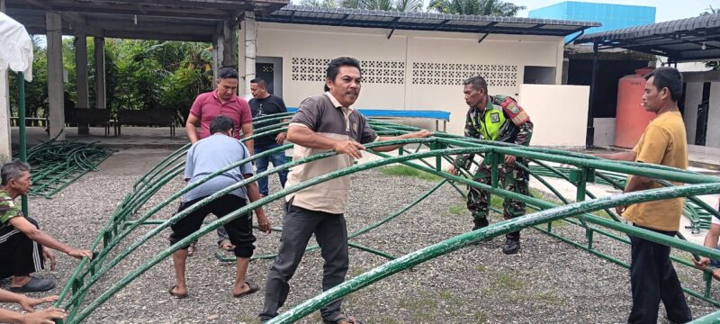 Nagan Raya Agaranews.com – Bintara Pembina Desa (Babinsa) Posramil Kuala Pesisir Kodim 0116/Nara Sertu Nanang Rusdiyanto bersama warga melaksanakan gotong- royong pemasangan tenda untuk acara Maulid Nabi di Desa Suak Pumtong Kecamatan Kuala Pesisir Kabupaten Nagan Raya Kamis,(30/10/2025).