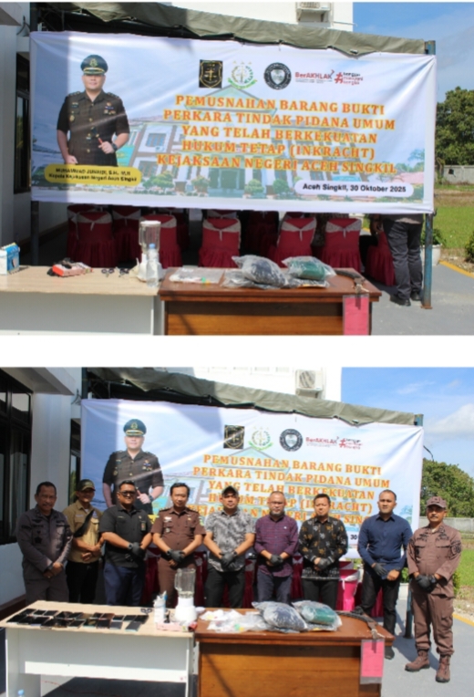 Aceh Singkil, agaranews.com – Kejaksaan Negeri Aceh Singkil melaksanakan kegiatan pemusnahan barang bukti narkoba dan perkara tindak pidana lainnya di halaman kantor Kejaksaan Negeri Aceh Singkil pada hari Kamis, 30 Oktober 2025. Pemusnahan dilakukan dengan cara membakar barang bukti hingga musnah dan tidak dapat digunakan lagi.