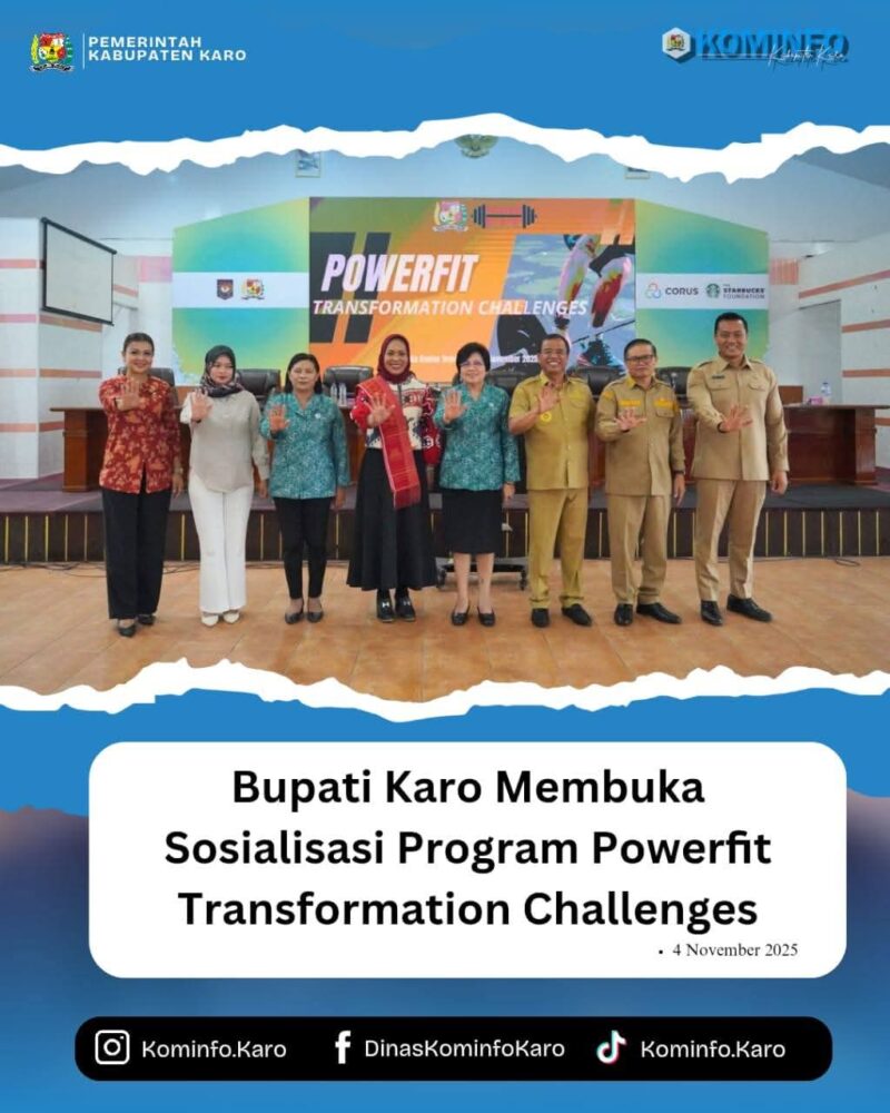 Tanah Karo, AgaraNews.com //.Bupati Karo, Brigjen Pol (Purn) Dr. dr. Antonius Ginting, Sp.OG., M.Kes., didampingi Wakil Bupati Karo, Komando Tarigan, SP., Sekda Kab.Karo, Gelora Kurnia Putra Ginting, S.STP., MM., membuka Sosialisasi Program Powerfit Transformation Challeges di Aula Kantor Bupati Karo pada Selasa (4/11/2025)