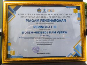 Malang, AgaraNews.com /!/ Korem 083/Baladhika Jaya kembali mencatatkan kinerja positif dalam pengelolaan anggaran. Pada kegiatan Press Release APBN dan Penyerahan Penghargaan Satker Terbaik KPPN Malang Triwulan III Tahun 2025, Korem 083/Bdj berhasil meraih posisi peringkat III untuk kategori pagu anggaran Rp150 miliar. Acara digelar di Aula RCE Center Gedung Cagar Budaya KPPN Malang, Kamis (5/11/2025).