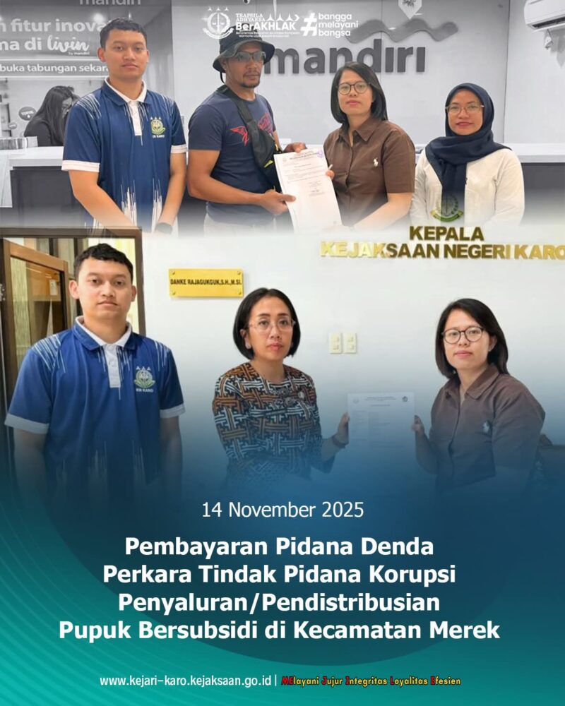 Tanah Karo – 14 November 2025, AgaraNews .com // Kejaksaan Negeri Karo kembali menerima pembayaran pidana berupa uang denda sebesar Rp 50.000.000,- (lima puluh juta rupiah) dari terpidana Rinton Karo Sekali dan Ismayani Haloho dalam perkara Tindak Pidana Korupsi Penyaluran/Pendistribusian Pupuk Bersubsidi di Kecamatan Merek, Kabupaten Karo, tahun 2022.
