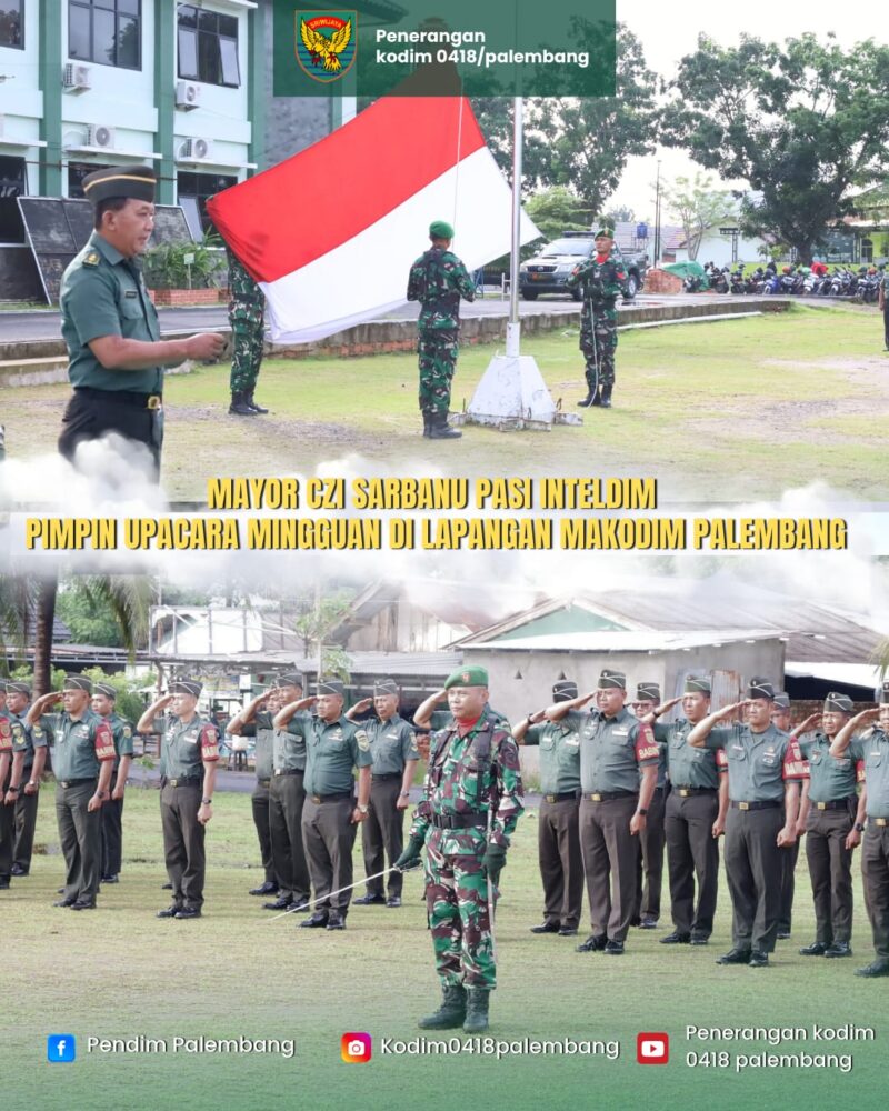 Palembang, AgaraNews .com // Pasi Intel Kodim 0418/Palembang Mayor Czi Sarbanu memimpin pelaksanaan upacara mingguan yang digelar di Lapangan Makodim 0418/Palembang, Senin pagi. Upacara ini merupakan agenda rutin yang bertujuan meningkatkan kedisiplinan prajurit serta memperkuat jiwa korsa di lingkungan Kodim.