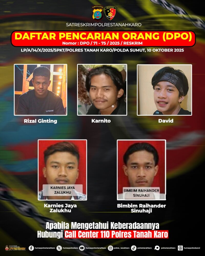 Adapun nama-nama yang masuk dalam daftar pencarian tersebut adalah Rizal Ginting, Karnito, David, Karnies Jaya Zalukh, dan Bimbim Raihander Sinuhaji. Langkah penerbitan DPO ini dilakukan guna mempercepat proses penyelidikan dan penegakan hukum terhadap para terduga pelaku yang hingga kini masih dalam pencarian.
