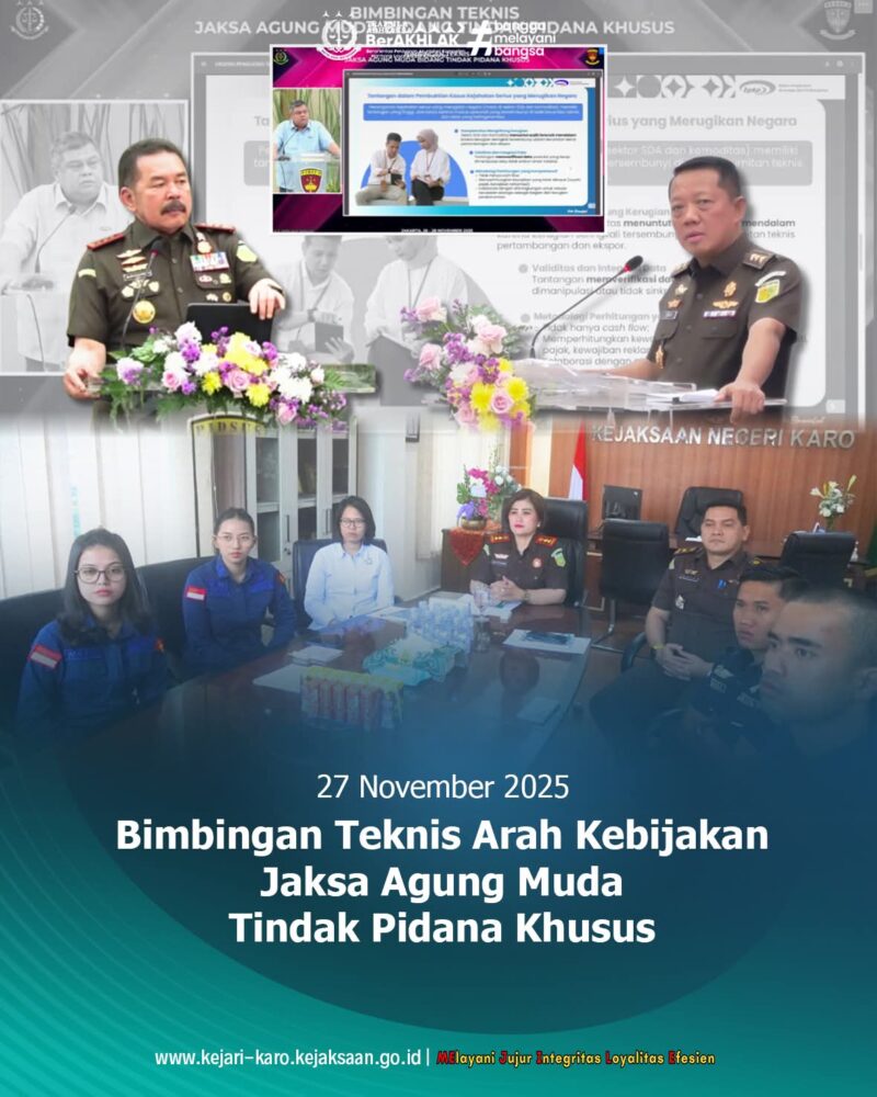 Tanah Karo, 27 November 2025, AgaraNews .com // Pada Kamis, 27 November 2025, Kepala Kejaksaan Negeri Karo Ibu Danke Rajagukguk, S.H., (tautan tidak tersedia), bersama Kasi Pidsus, para Kasubsi, Jabatan Fungsional (JF), dan staf mengikuti Bimbingan Teknis (Bimtek) Arahan Kebijakan Jaksa Agung Muda Tindak Pidana Khusus (Pidsus) secara virtual melalui Zoom Meeting. Kegiatan ini diselenggarakan dalam rangka penyelarasan dan penguatan implementasi kebijakan terbaru di bidang pidana khusus yang menjadi fokus strategis Kejaksaan RI saat ini.