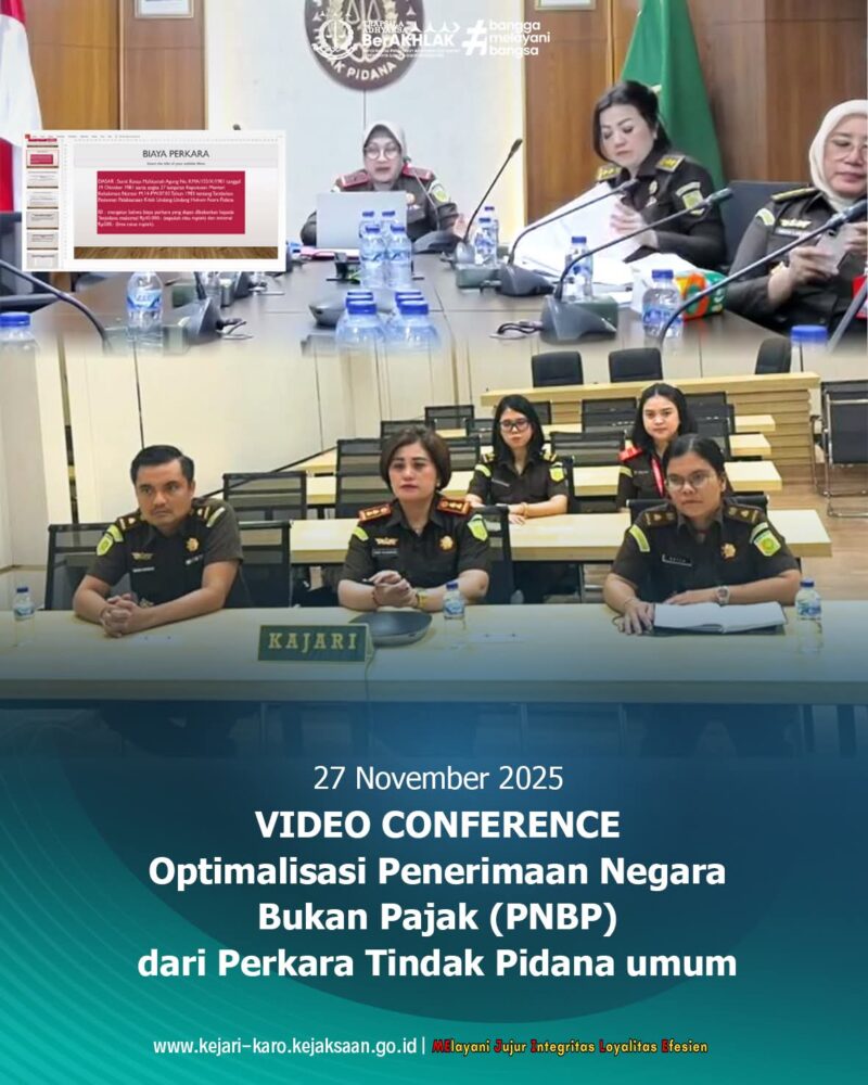 Tanah Karo, 27 November 2025, AgaraNews .com // Pada Kamis, 27 November 2025, Kepala Kejaksaan Negeri (Kejari) Karo, Ibu Danke Rajagukguk, S.H., (tautan tidak tersedia), bersama Kasi Pidum, Kasi PAPBB, dan staf mengikuti Video Conference “Optimalisasi Penerimaan Negara Bukan Pajak (PNBP) dari Perkara Tindak Pidana Umum”. Acara ini diselenggarakan sejalan dengan upaya Kejaksaan RI untuk meningkatkan capaian PNBP yang telah menunjukkan hasil signifikan di tahun-tahun sebelumnya, seperti tercapainya realisasi PNBP yang melampaui target pada 2023 dan 2024.