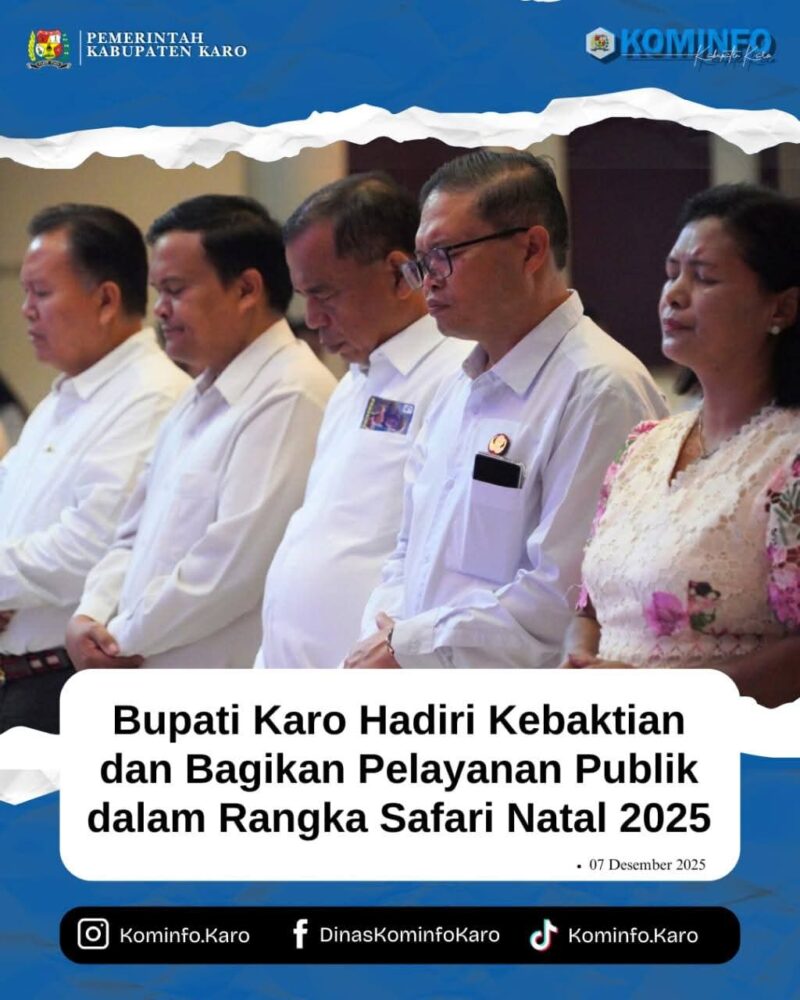 Tanah Karo, AgaraNews.com // Pemerintah Kabupaten Karo memulai rangkaian kegiatan Safari Natal Tahun 2025 dengan penuh sukacita dan semangat berbagi kasih. Bupati Karo, Brigjen Pol (Purn) Dr. dr. Antonius Ginting, Sp. OG., M.Kes., didampingi oleh Wakil Bupati, Komando Tarigan, S.P dan jajaran Organisasi Perangkat Daerah (OPD) terkait, menghadiri kebaktian Natal di GPdI Betesda dan Gereja Katolik Santa Perawan Maria Diangkat ke Surga sebagai salah satu lokasi Safari Natal, Minggu (07/12/2025).