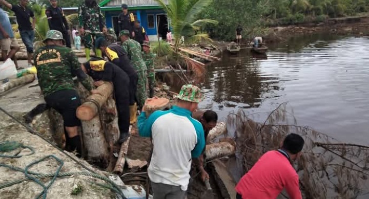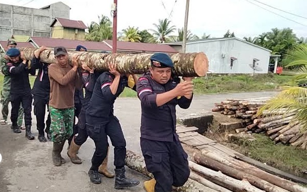 Di tengah kondisi sulit tersebut, semangat kebersamaan justru tumbuh semakin kuat. TNI, Polri, Dinas Perhubungan, serta komponen cadangan turun langsung ke lapangan untuk membangun jembatan darurat. Dengan memanfaatkan batang kelapa sebagai bahan utama, seluruh elemen bahu-membahu mengangkat dan menyusun rangka jembatan agar segera dapat difungsikan kembali.
