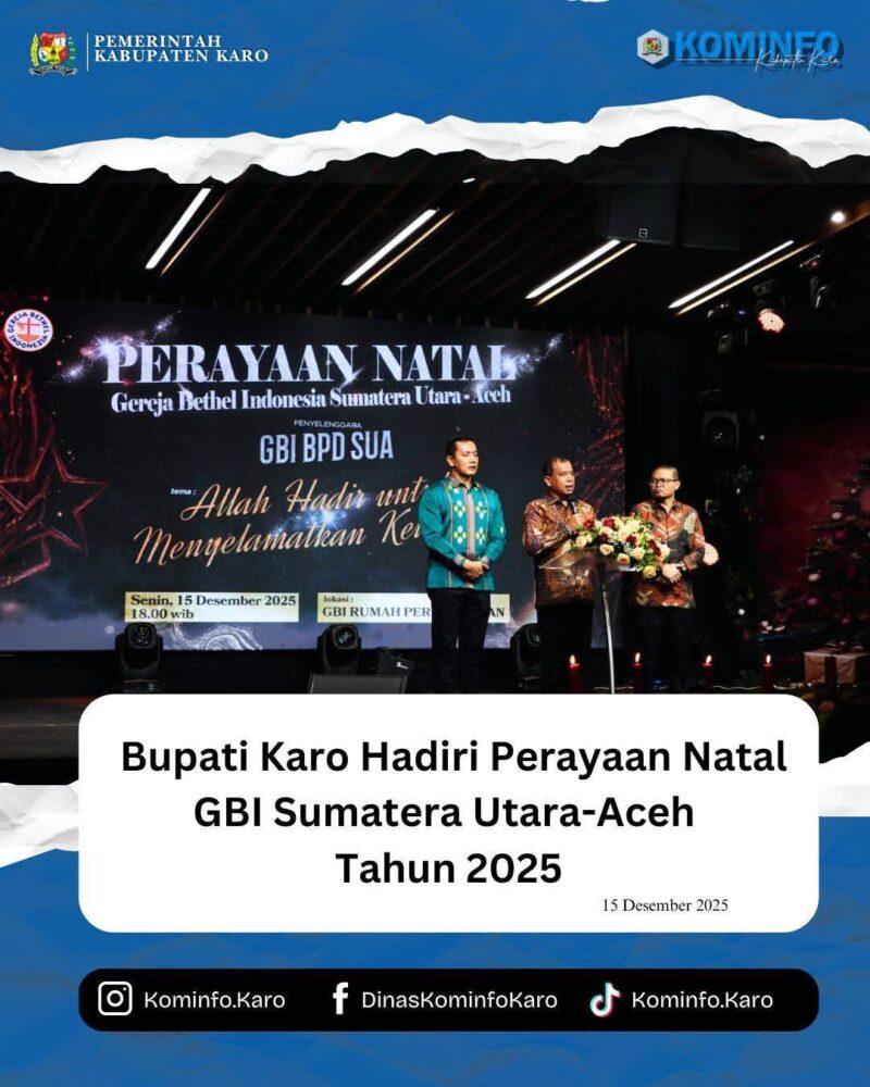 Medan, 15 Desember 2025, AgaraNews.com / / Bupati Karo Brigjen Pol (Purn) Dr. dr. Antonius Ginting, Sp.OG., M.Kes, bersama Wakil Bupati Karo Komando Tarigan, SP, dan Sekretaris Daerah Kabupaten Karo Gelora Kurnia Putra Ginting, S.STP., MM, menghadiri Perayaan Natal Gereja Bethel Indonesia (GBI) Sumatera Utara-Aceh Tahun 2025 di GBI Rumah Persembahan, Medan. Perayaan Natal dengan tema “Allah Hadir Untuk Menyelamatkan Keluarga” (Matius 1:21-24) ini dihadiri oleh sekitar 4.000 jemaat dan tokoh masyarakat.