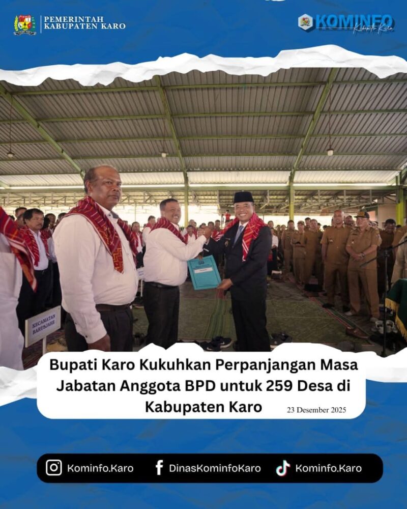 Tanah Karo – 23/12/2025, AgaraNews.com //.Bupati Karo Brigjen Pol (Purn) Dr.dr. Antonius Ginting, Sp.OG., M.Kes secara resmi mengukuhkan perpanjangan masa keanggotaan Badan Permusyawaratan Desa (BPD) bagi 7 Kecamatan di wilayah Kabupaten Karo diantaranya :