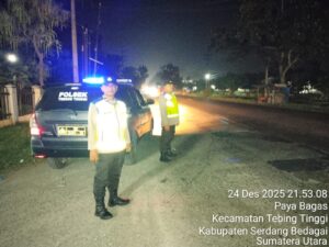 Sergai,Agaranews.com // Personel Polsek Tebingtinggi Resor Tebingtinggi Aiptu Sutarno, Aipda L Maharaja dan Aipda A Sembiring melaksanakan patroli blue light sebagai bentuk antisipasi tindak kriminal dan kejahatan jalanan pada malam hari yang berlangsung di sejumlah lokasi wilayah hukum Polsek Tebingtinggi, Rabu malam (24/12/2025).