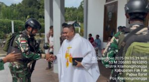 Fakfak, AgaraNews .com //.Dalam rangka memberikan rasa aman dan nyaman kepada masyarakat yang melaksanakan ibadah Hari Raya Natal, Pos Kramamongga melaksanakan kegiatan pengamanan ibadah Natal di Gereja Santo Petrus, Distrik Kramamongga, Kabupaten Fakfak, Provinsi Papua Barat, Kamis (25/12/2025).