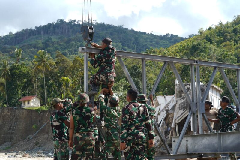 Nagan Raya, Agaranews.com – Tak Menghiraukan cuaca yang tidak menentu Prajurit TNI terus Kebut perakitan pemasangan panel, gelagar lintang, penguatan struktur, dan pemasangan topang silang untuk Percepat Akses Jalan Jembatan untuk memperlancar Perekonomian Masyarakat Prajurit TNI AD terus mengerjakan pemasangan jembatan bailey di kawasan Kecamatan Beutong Ateuh Benggalang Kabupaten Nagan Raya, Kamis (25/12/2025).