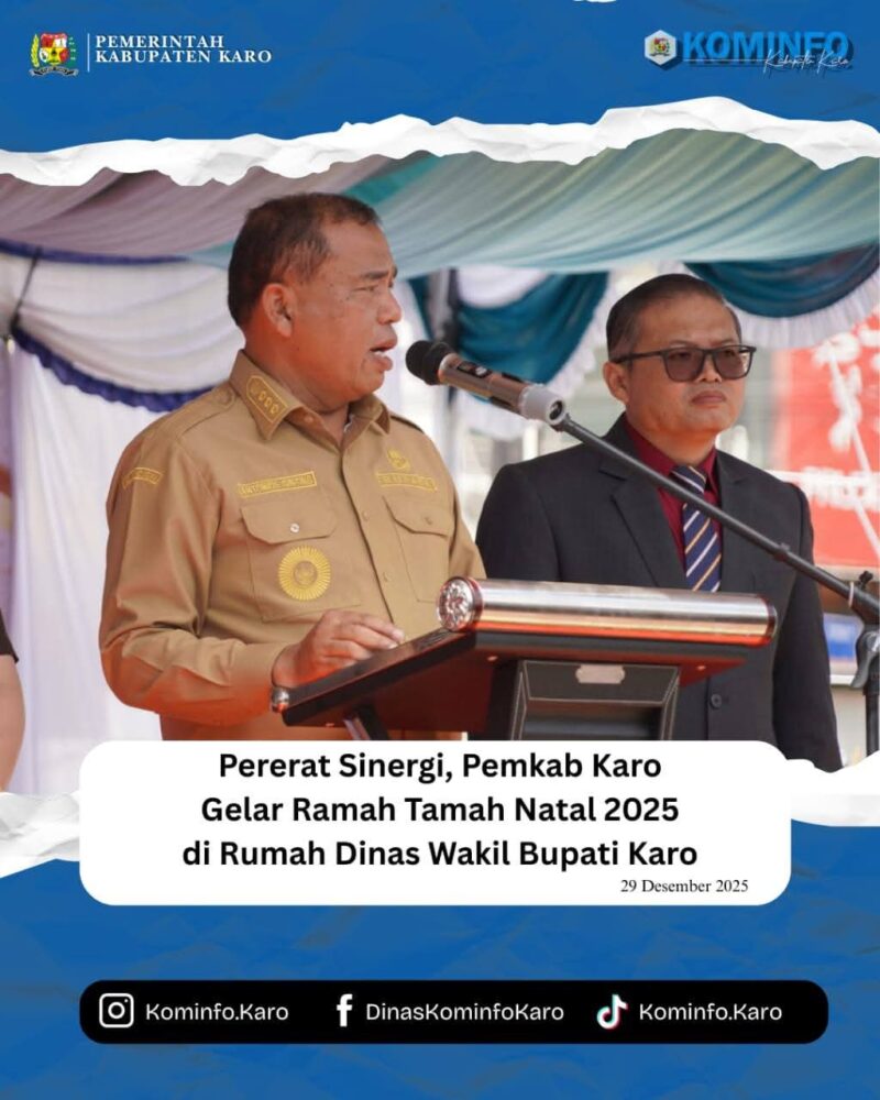 Tanah Karo, AgaraNews.com // Pemerintah Kabupaten Karo menggelar acara Ramah Tamah Natal 2025 yang berlangsung dengan khidmat dan penuh kekeluargaan pada Senin (29/12). Acara yang dilaksanakan di Rumah Dinas Wakil Bupati Karo, dimana Wakil Bupati Karo, Komando Tarigan, SP., sebagai Tuan Rumah Ramah Tamah Natal 2025. Kegiatan ini dihadiri langsung oleh Bupati Karo, Brigjen Pol (Purn) Dr. dr. Antonius Ginting, Sp.OG., M.Kes, Forkopimda, Sekda Kab.Karo, Gelora Kurnia Putra Ginting, S.STP., MM., Ketua TP PKK Kab Karo, Ketua DWP Kab.Karo, Pejabat Struktural dan para ASN di lingkungan Pemerintah Kabupaten Karo.