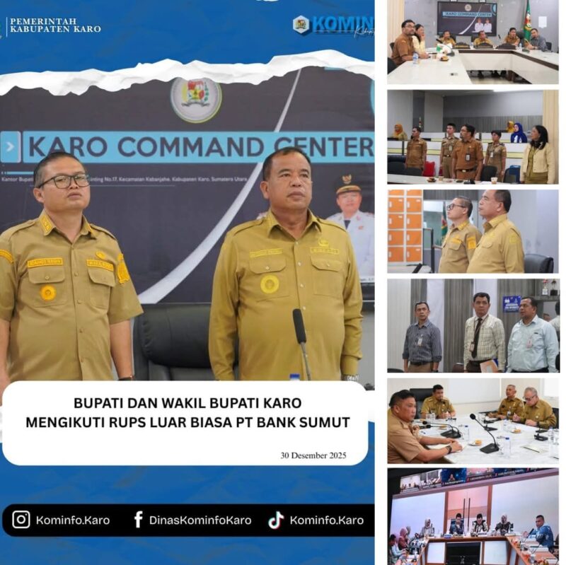 Tanah Karo, AgaraNews.com // Bupati Karo, Brigjen Pol (Purn) Dr. dr. Antonius Ginting, Sp.OG., M.Kes., dan Wakil Bupati Karo, Komando Tarigan, SP., mengikuti Rapat Umum Pemegang Saham (RUPS) Luar Biasa PT Bank Sumut yang dilaksanakan secara daring melalui Zoom Meeting di Ruang KCC Kantor Bupati Karo, Selasa (30/12).