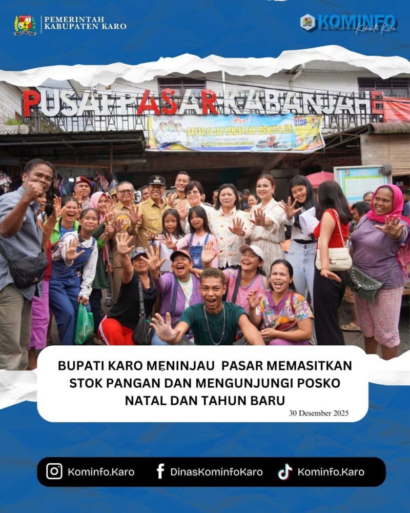 Tanah Karo, AgaraNews.com //.Bupati Karo, Brigjen Pol (Purn) Dr. dr. Antonius Ginting, Sp.OG., M.Kes., melakukan peninjauan ke Pusat Pasar Kabanjahe untuk memastikan ketersediaan dan harga bahan pokok menjelang Hari Besar Keagamaan Nasional (HBKN) Natal 2025 dan Tahun Baru 2026. Peninjauan ini merupakan upaya Pemerintah Kabupaten Karo dalam pengendalian inflasi serta menjaga daya beli masyarakat.